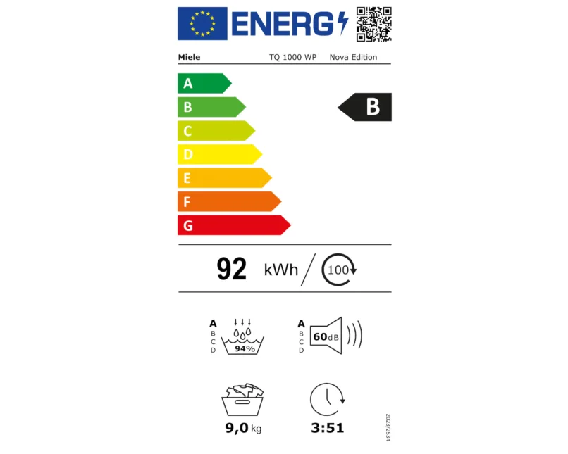 Weighted Energy Consumption per 100 cycles (ECO Dry for Cupboard): 92 kWh